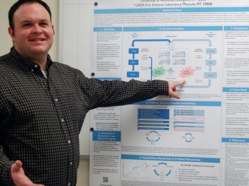 Fugate worked with his UK advisors Kozo Saito, director of the Institute of Research for Technology Development (IR4TD); Nelson Akafuah, assistant research professor of mechanical engineering; and Abbot Maginnis, academic program coordinator in the Lean Systems Program; alongside U.S. Department of Agriculture researchers Mark A. Finney and Jason Forthofer, to produce a paper for the international conference titled, "A Focused Analysis on Lean Fire Management Systems." The paper proposes the application of lean manufacturing techniques to fire services, particularly root cause analysis and systematic problem-solving to post-incident reflection meetings for facilitation of continuous improvement.